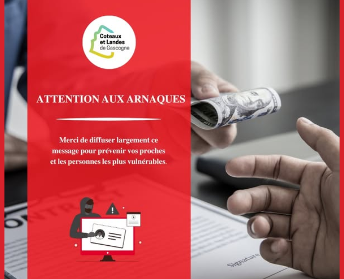 Actualités Imprimer E-mail Retrouvez les informations de la commune sur Facebook et IntraMuros ATTENTION ARNAQUE AU CALENDRIERS SUR LA COMMUNE 𝐀𝐓𝐓𝐄𝐍𝐓𝐈𝐎𝐍 𝐀𝐔𝐗 𝐀𝐑𝐍𝐀𝐐𝐔𝐄𝐒 Des tentatives d’arnaques sont signalées dans le secteur : Fausses ventes de calendriers par des individus se présentant comme éboueurs ou agents publics. Utilisation de terminaux de paiement bancaires pour tenter de faire payer des montants supérieurs. Présentation de fausses cartes professionnelles pour gagner la confiance. 𝐑𝐚𝐩𝐩𝐞𝐥 𝐢𝐦𝐩𝐨𝐫𝐭𝐚𝐧𝐭 : • Les agents de collecte ou services publics ne procèdent pas à des ventes à domicile sans communication officielle préalable. • Ne laissez entrer personne sans identification certaine. • Ne procédez jamais à un paiement si vous avez le moindre doute. • En cas de situation suspecte : appelez immédiatement la mairie ou le 17. 𝐌𝐞𝐫𝐜𝐢 𝐝𝐞 𝐝𝐢𝐟𝐟𝐮𝐬𝐞𝐫 𝐥𝐚𝐫𝐠𝐞𝐦𝐞𝐧𝐭 𝐜𝐞 𝐦𝐞𝐬𝐬𝐚𝐠𝐞 𝐩𝐨𝐮𝐫 𝐩𝐫𝐞́𝐯𝐞𝐧𝐢𝐫 𝐯𝐨𝐬 𝐩𝐫𝐨𝐜𝐡𝐞𝐬 𝐞𝐭 𝐥𝐞𝐬 𝐩𝐞𝐫𝐬𝐨𝐧𝐧𝐞𝐬 𝐥𝐞𝐬 𝐩𝐥𝐮𝐬 𝐯𝐮𝐥𝐧𝐞́𝐫𝐚𝐛𝐥𝐞𝐬. ARNAQUE A LA RENOVATION ENERGETIQUE Attention !! Nous observons, ces derniers jours, une recrudescence des cas de fraudes sur le territoire lot-et-garonnais avec des entreprises se faisant passer pour des conseillers du service public France Rénov’ !! Les services publics ne font jamais de démarchage commercial : ni par téléphone, ni par e-mail, ni en porte-à-porte. C’est normal : par définition, le service public n’a rien à vous vendre. Si vous êtes démarché(e) par une personne se présentant comme conseiller France Rénov’ ou Maison de l’Habitat, il s’agit donc d’une fraude ou d’une tentative d’escroquerie. Pour vous protéger des arnaques, retrouvez toutes les informations ICI : se prémunir contre les fraudes Pour contacter un VRAI conseiller France Renov’ près de chez vous : Maison de l’habitat – 05 53 64 87 87 – Cette adresse e-mail est protégée contre les robots spammeurs. Vous devez activer le JavaScript pour la visualiser. 35 rue Léopold Faye 47200 Marmande 202509_flyer-fraude_WEB-1 Poids: 878.91 ko Format: PDF Preview NOUVELLE CAMPAGNE INFLUENZA AVIAIRE ASSOCIATIONS RÈGLEMENTATION PRÉLÈVEMENTS D'EAU EN LOT-ET-GARONNE 2025-10-30_AP_secheresse-NUM Poids: 2.00 mo Format: PDF Preview QUELLE EAU BUVEZ-VOUS? DÉCHETS - ARRÊT DE LA TOURNÉE DE RAMASSAGE NOUVELLE ORGANISATION DES DÉCHETS ET DISTRIBUTION DES SACS JAUNES Des sacs jaunes pour les petits emballages souillés sont dès aujourd'hui disponibles en Mairie aux jours et heures d'ouverture du secrétariat (mardi, jeudi, vendredi de 13h30 à 17h30). 1 rouleau de 25 sacs vous sera remis pour les petits emballages souillés que vous ne voulez pas manipuler pour le dépôt en vrac dans la borne de tri jaune (ex : pots de yaourts, boites de sardines, petites capsules de bouteilles, capsules de café usagées). (1 sac = 30L, 1 rouleau équivaut à 2 sacs par mois) FRANCE SERVICES AIDE AUX TRAVAUX D'ADAPTATION DU LOGEMENT DONNEZ VOS BOUCHONS! Une boîte destinée à les recevoir est installée dans la salle d'attente de la Mairie INFORMATION La Communauté de Communes de Coteaux et Landes de Gascogne, en lien avec l'association du Pôle de santé, travaille depuis plusieurs années pour améliorer l'accès aux soins sur notre territoire. Des partenariats ont ainsi pu être mis en place avec les Centres Hospitaliers d'Agen/Nérac et Marmande/Tonneins, permettant à des chirurgiens volontaires de venir tenir des consultations à la MSP. Vous trouverez ci-dessous des affiches présentant les spécialités et les chirurgiens concernés, ainsi que les modalités pour la prise de rendez-vous. INTRA MUROS ALERTE AUX PIÈGES PAR TÉLÉPHONE Plus d'informations sur notre page : http://mairie-saintemarthe.fr/securite/pieges-telephone-et-internet.html CONTACTS UTILES ORANGE CALENDRIER 2025 COLLECTE TRI SÉLECTIF INFOS ET CONSEILS PRATIQUES : LUTTE CONTRE LE MOUSTIQUE TIGRE PASS' BONNE CONDUITE TÉLÉCONSULTATION RENOUVELLEMENT DES TITRES D'IDENTITÉ Les liens: Pré-demande en ligne : https://passeport.ants.gouv.fr/demarches-en-ligne Liste des mairies équipées du dispositif : http://www.lot-et-garonne.gouv.fr/liste-des-mairies-du-departement-equipees-du-a1111.html Liste des documents à fournir : https://www.service-public.fr/particuliers/vosdroits/N19810 LE COIN DES ASSOS DÉMARCHAGE Plateforme téléphonique Centre d'Information des Droits des Femmes et des Familles Saisine par voie électronique Chaque usager peut choisir de saisir les services de l'État par voie électronique, de la même manière que par voie postale. Il est ainsi possible d'effectuer un certain nombre de démarches sans avoir à se déplacer dans les locaux de l'administration. La commune de Sainte-Marthe vient de mettre en place ce service à l'adresse suivante: https://cgd47.demarches.sictiam.fr/ Précédent Suivant