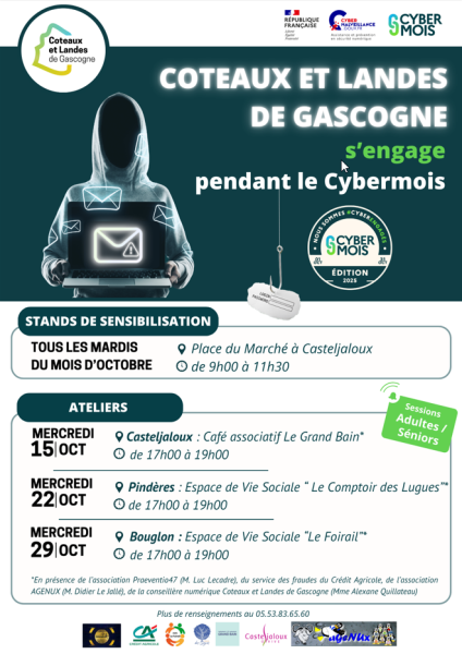 Actualités Imprimer E-mail Retrouvez les informations de la commune sur Facebook et IntraMuros ANIMATIONS VENDREDI 31 OCTOBRE A SAINTE-MARTHE de 18h00 à 19h00, rencontre musicale à la chapelle de Saint-Sauveur avec le duo de musiciens, Théodore Lefeuvre (accordéon) et Loïc Vergnaux (clarinette) à 21h00 à la salle des fêtes, le bal électrique, Le Mange Bal et Beat Bouet Trio CYBER MOIS Dans le cadre du Cybermois 2025, la communauté de communes Coteaux et Landes de Gascogne organise plusieurs ateliers gratuits de sensibilisation aux cybermenaces à destination des adultes et des séniors de notre territoire. 👉 L’objectif : informer, échanger et partager les bons réflexes pour se protéger face aux arnaques en ligne, aux fraudes, usages et dangers du numérique. Les ateliers auront lieu : Mercredi 15 octobre de 17h à 19h au café associatif « Le Grand Bain » à Casteljaloux, Mercredi 22 octobre de 17h à 19h à l’Espace de Vie Sociale « Le comptoir des Lugues » à Pindères, Mercredi 29 octobre de 17h à 19h à l’Espace de Vie Sociale « Le Foirail » à Bouglon. Ces temps d’échanges se dérouleront en présence de différents intervenants : associations spécialisées, service fraudes du Crédit Agricole, conseillère numérique de la collectivité, etc. ASSOCIATIONS RÈGLEMENTATION PRÉLÈVEMENTS D'EAU EN LOT-ET-GARONNE 2025-10-04_AP_secheresse-signe-NUM Poids: 2.23 mo Format: PDF Preview QUELLE EAU BUVEZ-VOUS? DÉCHETS - ARRÊT DE LA TOURNÉE DE RAMASSAGE NOUVELLE ORGANISATION DES DÉCHETS ET DISTRIBUTION DES SACS JAUNES Des sacs jaunes pour les petits emballages souillés sont dès aujourd'hui disponibles en Mairie aux jours et heures d'ouverture du secrétariat (mardi, jeudi, vendredi de 13h30 à 17h30). 1 rouleau de 25 sacs vous sera remis pour les petits emballages souillés que vous ne voulez pas manipuler pour le dépôt en vrac dans la borne de tri jaune (ex : pots de yaourts, boites de sardines, petites capsules de bouteilles, capsules de café usagées). (1 sac = 30L, 1 rouleau équivaut à 2 sacs par mois) FRANCE SERVICES AIDE AUX TRAVAUX D'ADAPTATION DU LOGEMENT DONNEZ VOS BOUCHONS! Une boîte destinée à les recevoir est installée dans la salle d'attente de la Mairie INFORMATION La Communauté de Communes de Coteaux et Landes de Gascogne, en lien avec l'association du Pôle de santé, travaille depuis plusieurs années pour améliorer l'accès aux soins sur notre territoire. Des partenariats ont ainsi pu être mis en place avec les Centres Hospitaliers d'Agen/Nérac et Marmande/Tonneins, permettant à des chirurgiens volontaires de venir tenir des consultations à la MSP. Vous trouverez ci-dessous des affiches présentant les spécialités et les chirurgiens concernés, ainsi que les modalités pour la prise de rendez-vous. INTRA MUROS ALERTE AUX PIÈGES PAR TÉLÉPHONE Plus d'informations sur notre page : http://mairie-saintemarthe.fr/securite/pieges-telephone-et-internet.html CONTACTS UTILES ORANGE CALENDRIER 2025 COLLECTE TRI SÉLECTIF INFOS ET CONSEILS PRATIQUES : LUTTE CONTRE LE MOUSTIQUE TIGRE PASS' BONNE CONDUITE TÉLÉCONSULTATION RENOUVELLEMENT DES TITRES D'IDENTITÉ Les liens: Pré-demande en ligne : https://passeport.ants.gouv.fr/demarches-en-ligne Liste des mairies équipées du dispositif : http://www.lot-et-garonne.gouv.fr/liste-des-mairies-du-departement-equipees-du-a1111.html Liste des documents à fournir : https://www.service-public.fr/particuliers/vosdroits/N19810 LE COIN DES ASSOS DÉMARCHAGE Plateforme téléphonique Centre d'Information des Droits des Femmes et des Familles Saisine par voie électronique Chaque usager peut choisir de saisir les services de l'État par voie électronique, de la même manière que par voie postale. Il est ainsi possible d'effectuer un certain nombre de démarches sans avoir à se déplacer dans les locaux de l'administration. La commune de Sainte-Marthe vient de mettre en place ce service à l'adresse suivante: https://cgd47.demarches.sictiam.fr/ Précédent Suivant