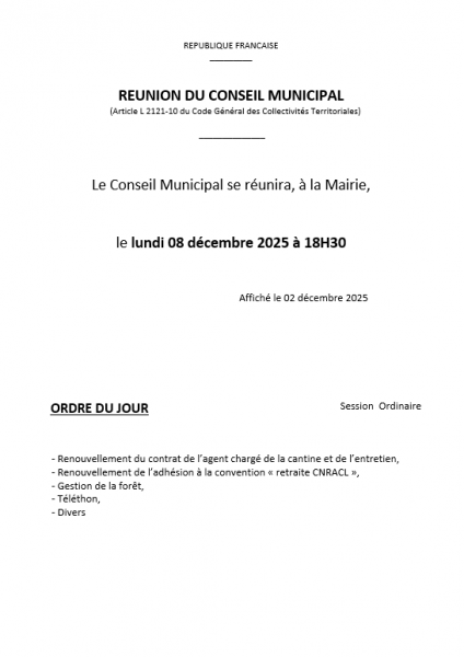 Réunions du Conseil Municipal et comptes-rendus Imprimer E-mail Réunion du 27 octobre 2025 LISTE DES DELIBERATIONS 2025 10 27 Poids: 539.66 ko Format: PDF Preview Réunion du 25 août 2025 PV 2025 08 25 Poids: 771.78 ko Format: PDF Preview Réunion du 17 juin 2025 PV 2025 06 17 Poids: 726.13 ko Format: PDF Preview Réunion du 07 avril 2025 PV 2025 04 07 Poids: 317.42 ko Format: PDF Preview Réunion du 17 février 2025 PV 2025 02 17 Poids: 567.40 ko Format: PDF Preview Réunion du 09 décembre 2024 PV 12 09 Poids: 581.57 ko Format: PDF Preview Réunion du 30 septembre 2024 PV 09 30 Poids: 572.61 ko Format: PDF Preview Réunion du 20 juin 2024 PV 06 20 Poids: 485.58 ko Format: PDF Preview Réunion du 08 avril 2024 PV 04 08 Poids: 297.05 ko Format: PDF Preview Réunion du 25 mars 2024 PV 03 25 Poids: 636.00 ko Format: PDF Preview Réunion du 19 février 2024 PV 02 19 Poids: 670.41 ko Format: PDF Preview Réunion du 04 décembre 2023 PV 12 04 Poids: 869.12 ko Format: PDF Preview Réunion du 16 octobre 2023 PV 10 16 Poids: 594.58 ko Format: PDF Preview Réunion du 26 juin 2023 PV 06 26 Poids: 243.66 ko Format: PDF Preview Réunion du 09 juin 2023 PV 06 09 Poids: 217.47 ko Format: PDF Preview Réunion du 24 avril 2023 PV 04 24 Poids: 190.89 ko Format: PDF Preview Réunion du 11 avril 2023 PV 04 11 Poids: 184.42 ko Format: PDF Preview Réunion du 05 décembre 2022 PV 12 05 Poids: 504.10 ko Format: PDF Preview Réunion du 03 octobre 2022 De nouvelles règles de publicité, de conservation et d'entrée en vigueur des actes de collectivités sont appliquées depuis le 1er juillet 2022. Le compte-rendu synthétique de la séance mis à disposition du public dans la semaine disparaît au profit d'une liste des délibérations examinées en séance (article L.2121-25 du CGCT). Le PV devient le document de référence unique des séances et se substitue entièrement au compte-rendu. Le PV conserve les mêmes caractéristiques à savoir l'obligation de le rédiger, l'afficher et le mettre en ligne dans la semaine qui suit la séance au cours de laquelle a a été arrêté. PV séance du 03 octobre 2022 Poids: 925.70 ko Format: PDF Preview Réunion du 09 mai 2022 Compte-rendu 09 05 2022 Poids: 173.46 ko Format: PDF Preview Réunion Réunion du 11 avril 2022 Compte-rendu 11 04 2022 Poids: 169.24 ko Format: PDF Preview Réunion du 28 mars 2022 Compte-rendu 28 03 2022 Poids: 188.13 ko Format: PDF Preview Réunion du 02 février 2022 Compte-rendu 02 02 2022 Poids: 226.02 ko Format: PDF Preview Réunion du 17 décembre 2021 Compte-rendu 17 12 2021 Poids: 439.97 ko Format: PDF Preview Réunion du 29 novembre 2021 Compte-rendu 29 11 2021 Poids: 448.86 ko Format: PDF Preview Réunion du 22 novembre 2021 Compte-rendu 22 11 2021 Poids: 115.90 ko Format: PDF Preview Réunion du 27 octobre 2021 Compte-rendu 27 10 2021 Poids: 252.11 ko Format: PDF Preview Réunion du 11 octobre 2021 Compte-rendu 11 10 2021 Poids: 126.97 ko Format: PDF Preview Réunion du 05 juillet 2021 Compte-rendu 05 07 2021 Poids: 144.90 ko Format: PDF Preview Réunion du 07 juin 2021 Compte-rendu 07 06 2021 Poids: 124.62 ko Format: PDF Preview Réunion du 14 avril 2021 Compte-rendu 14 04 2021 Poids: 145.23 ko Format: PDF Preview Réunion du 25 janvier 2021 Compte-rendu 25 01 2021 Poids: 137.07 ko Format: PDF Preview Réunion du 21 décembre 2020 Compte-rendu 21 12 2020 Poids: 136.84 ko Format: PDF Preview Réunion du 30 novembre 2020 Compte-rendu 30 11 2020 Poids: 131.79 ko Format: PDF Preview Réunion du 21 septembre 2020 Compte-rendu 21 09 2020 Poids: 141.72 ko Format: PDF Preview Réunion du 06 juillet 2020 Compte-rendu 06 07 2020 Poids: 122.18 ko Format: PDF Preview Réunion du 08 juin 2020 Compte-rendu 08 06 2020 Poids: 444.72 ko Format: PDF Preview Réunion du 25 mai 2020 Compte-rendu 25 05 2020 Poids: 432.41 ko Format: PDF Preview Réunion du 24 février 2020 Compte-rendu 24 02 2020 Poids: 463.29 ko Format: PDF Preview Réunion du 02 décembre 2019 Compte-rendu 02 12 2019 Poids: 133.16 ko Format: PDF Preview Réunion du 21 octobre 2019 Compte-rendu 21 10 2019 Poids: 142.89 ko Format: PDF Preview Réunion du 22 juillet 2019 Compte-rendu 22 07 2019 Poids: 132.25 ko Format: PDF Preview Réunion du 17 juin 2019 Compte-rendu 17 06 2019 Poids: 145.25 ko Format: PDF Preview Réunion du 08 avril 2019 Compte-rendu 08 04 2019 Poids: 132.48 ko Format: PDF Preview Réunion du 28 janvier 2019 Compte rendu 28 01 2019 Poids: 435.15 ko Format: PDF Preview Réunion du 26 novembre 2018 Compte-rendu 26 11 2018 Poids: 138.65 ko Format: PDF Preview Réunion du 17 septembre 2018 Compte-rendu 17 09 2018 Poids: 149.14 ko Format: PDF Preview Réunion du 02 juillet 2018 Compte-rendu 02 07 2018 Poids: 140.36 ko Format: PDF Preview Réunion du 28 mai 2018 Compte-rendu 28 05 2018 Poids: 431.50 ko Format: PDF Preview Réunion du 03 avril 2018 Compte-rendu 03 04 2018 Poids: 445.70 ko Format: PDF Preview Réunion du 12 mars 2018 Compte-rendu 12 03 2018 Poids: 137.34 ko Format: PDF Preview Réunion du 22 janvier 2018 Compte-rendu 22 01 2018 Poids: 85.75 ko Format: PDF Preview Précédent Suivant