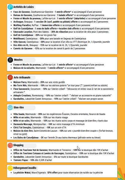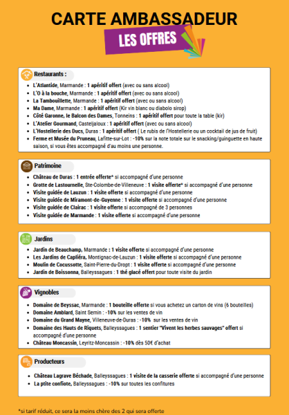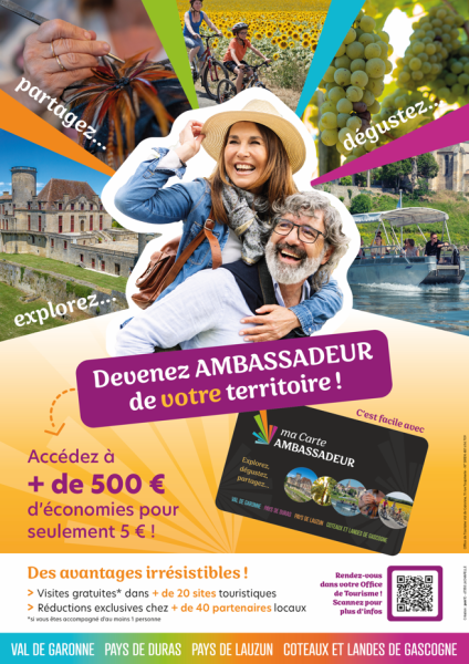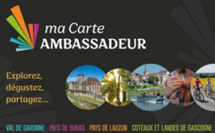 Tourisme - Carte Ambassadeur Imprimer E-mail Qu'est-ce que la carte Ambassadeur ? Vous recevez régulièrement de la famille ou des amis ? Vous êtes un amoureux de votre territoire et souhaitez le faire découvrir à vos proches ou vous souhaitez tout simplement partager des moments ente amis ? La carte Ambassadeur est faite pour vous ! Qui peut l'obtenir ? Devenez ambassadeur du Val de Garonne Guyenne Gascogne ! Vous habitez ou travaillez dans une commune du Val de Garonne Guyenne Gascogne ? Demandez votre carte Ambassadeur en Office de Tourisme. Balades en bateau, visites de patrimoine, dégustations, activités de loisirs, restaurants, ateliers créatifs... Vous allez (re)découvrir votre territoire ! Pour plus de précisions, cliquez ici https://www.tourisme-coteauxetlandesdegascogne.fr/index.php?option=com_sppagebuilder&view=page&id=85 Suivant