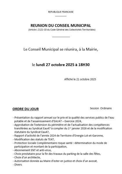 Réunions du Conseil Municipal et comptes-rendus Imprimer E-mail Réunion du 25 août 2025 LISTE DES DELIBERATIONS 2025 08 25 Poids: 162.38 ko Format: PDF Preview Réunion du 17 juin 2025 PV 2025 06 17 Poids: 726.13 ko Format: PDF Preview Réunion du 07 avril 2025 PV 2025 04 07 Poids: 317.42 ko Format: PDF Preview Réunion du 17 février 2025 PV 2025 02 17 Poids: 567.40 ko Format: PDF Preview Réunion du 09 décembre 2024 PV 12 09 Poids: 581.57 ko Format: PDF Preview Réunion du 30 septembre 2024 PV 09 30 Poids: 572.61 ko Format: PDF Preview Réunion du 20 juin 2024 PV 06 20 Poids: 485.58 ko Format: PDF Preview Réunion du 08 avril 2024 PV 04 08 Poids: 297.05 ko Format: PDF Preview Réunion du 25 mars 2024 PV 03 25 Poids: 636.00 ko Format: PDF Preview Réunion du 19 février 2024 PV 02 19 Poids: 670.41 ko Format: PDF Preview Réunion du 04 décembre 2023 PV 12 04 Poids: 869.12 ko Format: PDF Preview Réunion du 16 octobre 2023 PV 10 16 Poids: 594.58 ko Format: PDF Preview Réunion du 26 juin 2023 PV 06 26 Poids: 243.66 ko Format: PDF Preview Réunion du 09 juin 2023 PV 06 09 Poids: 217.47 ko Format: PDF Preview Réunion du 24 avril 2023 PV 04 24 Poids: 190.89 ko Format: PDF Preview Réunion du 11 avril 2023 PV 04 11 Poids: 184.42 ko Format: PDF Preview Réunion du 05 décembre 2022 PV 12 05 Poids: 504.10 ko Format: PDF Preview Réunion du 03 octobre 2022 De nouvelles règles de publicité, de conservation et d'entrée en vigueur des actes de collectivités sont appliquées depuis le 1er juillet 2022. Le compte-rendu synthétique de la séance mis à disposition du public dans la semaine disparaît au profit d'une liste des délibérations examinées en séance (article L.2121-25 du CGCT). Le PV devient le document de référence unique des séances et se substitue entièrement au compte-rendu. Le PV conserve les mêmes caractéristiques à savoir l'obligation de le rédiger, l'afficher et le mettre en ligne dans la semaine qui suit la séance au cours de laquelle a a été arrêté. PV séance du 03 octobre 2022 Poids: 925.70 ko Format: PDF Preview Réunion du 09 mai 2022 Compte-rendu 09 05 2022 Poids: 173.46 ko Format: PDF Preview Réunion Réunion du 11 avril 2022 Compte-rendu 11 04 2022 Poids: 169.24 ko Format: PDF Preview Réunion du 28 mars 2022 Compte-rendu 28 03 2022 Poids: 188.13 ko Format: PDF Preview Réunion du 02 février 2022 Compte-rendu 02 02 2022 Poids: 226.02 ko Format: PDF Preview Réunion du 17 décembre 2021 Compte-rendu 17 12 2021 Poids: 439.97 ko Format: PDF Preview Réunion du 29 novembre 2021 Compte-rendu 29 11 2021 Poids: 448.86 ko Format: PDF Preview Réunion du 22 novembre 2021 Compte-rendu 22 11 2021 Poids: 115.90 ko Format: PDF Preview Réunion du 27 octobre 2021 Compte-rendu 27 10 2021 Poids: 252.11 ko Format: PDF Preview Réunion du 11 octobre 2021 Compte-rendu 11 10 2021 Poids: 126.97 ko Format: PDF Preview Réunion du 05 juillet 2021 Compte-rendu 05 07 2021 Poids: 144.90 ko Format: PDF Preview Réunion du 07 juin 2021 Compte-rendu 07 06 2021 Poids: 124.62 ko Format: PDF Preview Réunion du 14 avril 2021 Compte-rendu 14 04 2021 Poids: 145.23 ko Format: PDF Preview Réunion du 25 janvier 2021 Compte-rendu 25 01 2021 Poids: 137.07 ko Format: PDF Preview Réunion du 21 décembre 2020 Compte-rendu 21 12 2020 Poids: 136.84 ko Format: PDF Preview Réunion du 30 novembre 2020 Compte-rendu 30 11 2020 Poids: 131.79 ko Format: PDF Preview Réunion du 21 septembre 2020 Compte-rendu 21 09 2020 Poids: 141.72 ko Format: PDF Preview Réunion du 06 juillet 2020 Compte-rendu 06 07 2020 Poids: 122.18 ko Format: PDF Preview Réunion du 08 juin 2020 Compte-rendu 08 06 2020 Poids: 444.72 ko Format: PDF Preview Réunion du 25 mai 2020 Compte-rendu 25 05 2020 Poids: 432.41 ko Format: PDF Preview Réunion du 24 février 2020 Compte-rendu 24 02 2020 Poids: 463.29 ko Format: PDF Preview Réunion du 02 décembre 2019 Compte-rendu 02 12 2019 Poids: 133.16 ko Format: PDF Preview Réunion du 21 octobre 2019 Compte-rendu 21 10 2019 Poids: 142.89 ko Format: PDF Preview Réunion du 22 juillet 2019 Compte-rendu 22 07 2019 Poids: 132.25 ko Format: PDF Preview Réunion du 17 juin 2019 Compte-rendu 17 06 2019 Poids: 145.25 ko Format: PDF Preview Réunion du 08 avril 2019 Compte-rendu 08 04 2019 Poids: 132.48 ko Format: PDF Preview Réunion du 28 janvier 2019 Compte rendu 28 01 2019 Poids: 435.15 ko Format: PDF Preview Réunion du 26 novembre 2018 Compte-rendu 26 11 2018 Poids: 138.65 ko Format: PDF Preview Réunion du 17 septembre 2018 Compte-rendu 17 09 2018 Poids: 149.14 ko Format: PDF Preview Réunion du 02 juillet 2018 Compte-rendu 02 07 2018 Poids: 140.36 ko Format: PDF Preview Réunion du 28 mai 2018 Compte-rendu 28 05 2018 Poids: 431.50 ko Format: PDF Preview Réunion du 03 avril 2018 Compte-rendu 03 04 2018 Poids: 445.70 ko Format: PDF Preview Réunion du 12 mars 2018 Compte-rendu 12 03 2018 Poids: 137.34 ko Format: PDF Preview Réunion du 22 janvier 2018 Compte-rendu 22 01 2018 Poids: 85.75 ko Format: PDF Preview Précédent Suivant